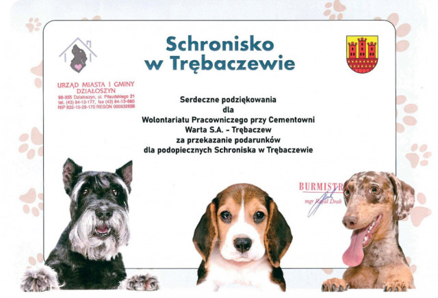 Cementownia Warta S.A. rozpoczęła program wolontariatu pracowniczego związanego z pomocą schroniskom dla bezdomnych zwierząt w Trębaczewie i Szczytach.