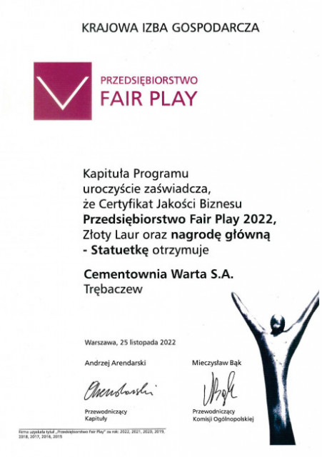 Certyfikat Przedsiębiorstwo Fair Play jest potwierdzeniem rzetelności i transparentności działań Cementowni Warta S.A., przejawiających się nie tylko w prowadzeniu biznesu, ale również w działalności prospołecznej i charytatywnej. Jest to wyjątkowe wyróżnienie poparte rzetelnym i wieloetapowym procesem weryfikacji. Staramy się być stabilnym partnerem biznesowym oraz społecznym. Cieszymy się, że w tych trudnych czasach nasz dorobek w tym zakresie jest oceniany pozytywnie. – powiedział Dariusz Gawlak Prezes Zarządu/Dyrektor Naczelny Cementowni Warta S.A.