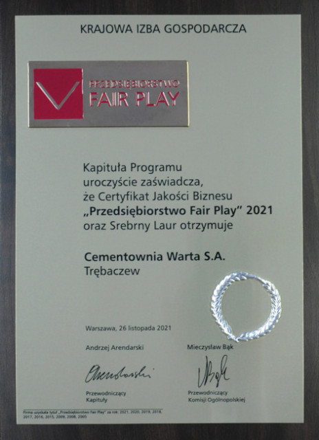 Certyfikat oraz srebrny laur Przedsiębiorstwo Fair Play 2021 odebrał podczas ubiegłotygodniowej Wielkiej Gali Finałowej programu „Przedsiębiorstwo Fair Play” w imieniu Cementowni Warta S.A. Prezes Zarządu/Dyrektor Naczelny p. Dariusz Gawlak .