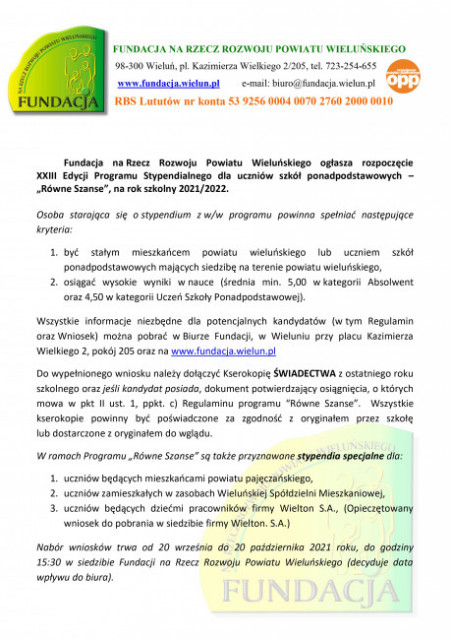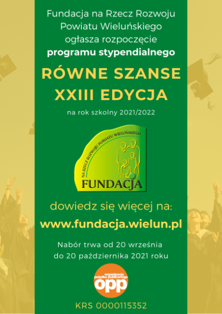 Fundacja na Rzecz Rozwoju Powiatu Wieluńskiego prowadzi nabór wniosków o stypendium dla uczniów szkół ponadpodstawowych w ramach programu „Równać Szanse”.