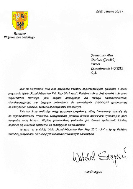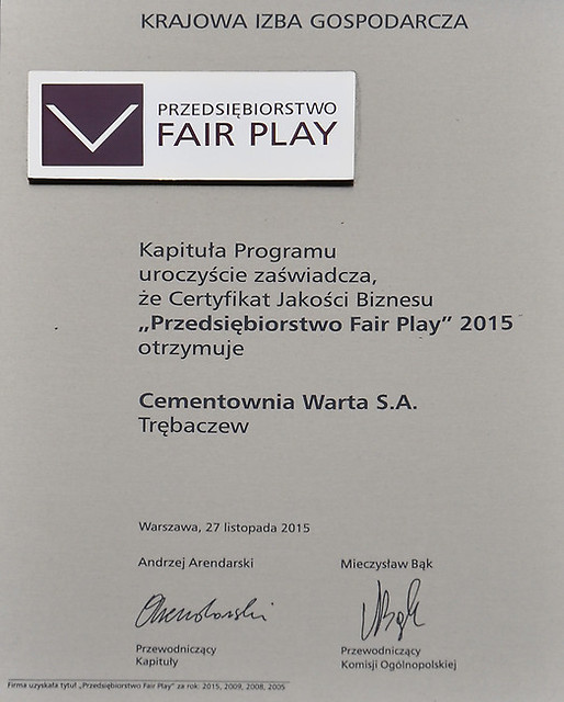 Z rąk Marszałka Województwa Łódzkiego certyfikat „Przedsiębiorstwo Fair Play 2015” odbierał Prezes Zarządu Cementowni Warta S.A. – Pan Dariusz Gawlak. „Nasza firma już po raz trzeci spełniła wszystkie regulaminowe wymagania Programu i została pozytywnie oceniona przez audytorów oraz regionalną i ogólnopolską kapitułę. Uzyskanie certyfikatu rzetelności „Przedsiębiorstwo Fair Play” to czytelny znak dla kontrahentów i partnerów społecznych, że Cementownia Warta S.A. funkcjonuje stosując najwyższe standardy etyczne w działalności gospodarczej. Zgodnie z regulaminem konkursu oceniane były m.in. stosowanie norm odpowiedzialnego postępowania we wzajemnych relacjach naszej firmy z klientami, kontrahentami, pracownikami, akcjonariuszami oraz społecznością lokalną, władzą lokalną i państwową. Cieszymy się, że nasze starania na tym polu, będące trwałym elementem funkcjonowania Cementowni Warta S.A., zostały kolejny raz docenione.” – powiedział Prezes Gawlak odbierając wyróżnienie.