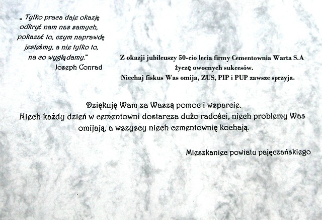 Rok 2014 jest dla nas – pracowników Cementowni „Warta” S.A. w Trębaczewie rokiem wyjątkowym. To czas pewnych refleksji, podsumowań, ale także okazja do świętowania okrągłego Jubileuszu. Cementownię Warta S.A. i jej obecną pozycję stworzyli pracujący w niej przez te wszystkie lata ludzie. To dzięki nim istniejemy już 50 lat z optymizmem patrząc w przyszłość. Jubileusz i przygotowana z tej okazji uroczysta Gala daje sposobność do spotkania wszystkich tych, którzy uczestniczyli w tworzeniu historii firmy, służyli jej radą, pomagali, czy udzielali kredytu zaufania i którym chcemy w ten sposób wyrazić podziękowanie. Szczególne podziękowania składamy dla naszych głównych akcjonariuszy, którzy w odpowiednim czasie zainwestowali w nasz zakład chroniąc go przed upadłością, a także nadal dbają o jego rozwój i unowocześnienie.
