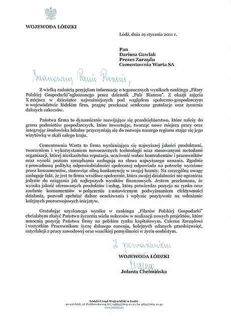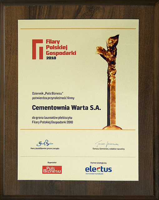 12 stycznia 2011r. w Warszawie odbyła się Gala wręczenia statuetek Filary Polskiej Gospodarki 2010 – VI edycji rankingu przygotowanego przez „Puls Biznesu” i czołową agencję badawczą Pentor Research International. W gronie 10 laureatów z województwa łódzkiego znalazła się również Cementownia „Warta”.