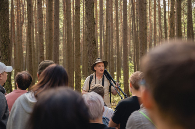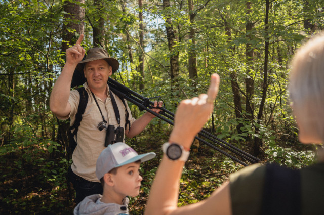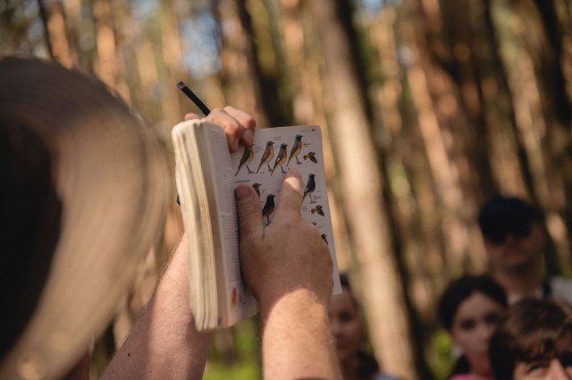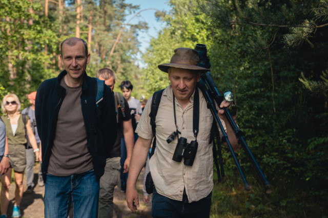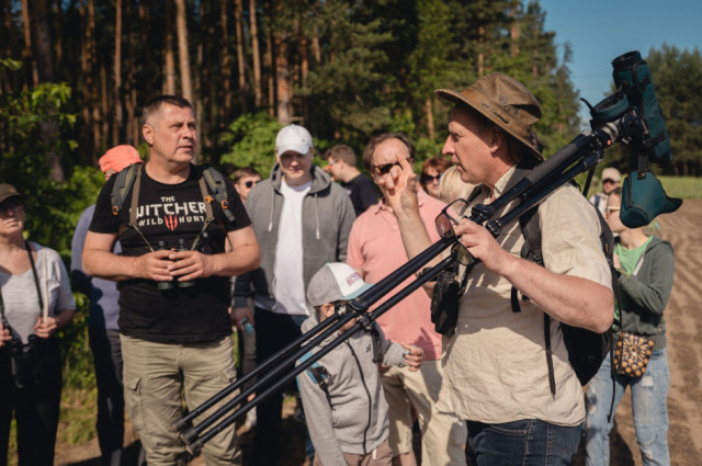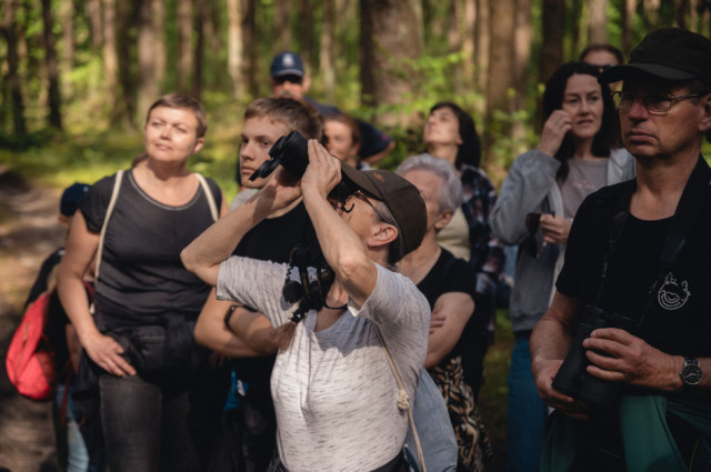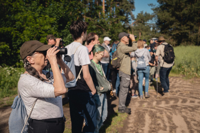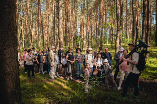 Wsłuchiwaliśmy się w głosy leśnych ptaków zamieszkujących bogatą strefę skraju lasu. Jeden z donośniejszych głosów należał do wilgi, która z oddali wołała „Zo-fija, Zo-fija”, ale ten egzotyczny żółto-czarny ptak z czerwonym dziobem nie pozwolił się oglądać. Podczas kolejnych przystanków udało nam się usłyszeć sikory – bogatkę i sosnówkę, pierwiosnka („cilp-calp”) i piecuszka (rytmiczny opadający trel), oraz kosa o spokojnym, powolnym wręcz, niskim fletowym śpiewie. Z pól słychać było melancholijne głosy lerki – skowronka borowego gniazdującego na skrajach lasów, pól i ugorów. Każde niemal zatrzymanie się w lesie umożliwiało usłyszenie kolejnych nowych głosów – dlatego napotkaliśmy też m.in. rudzika, pleszkę i świstunkę leśną z jej rozpędzającym się dźwięcznym terkotem.