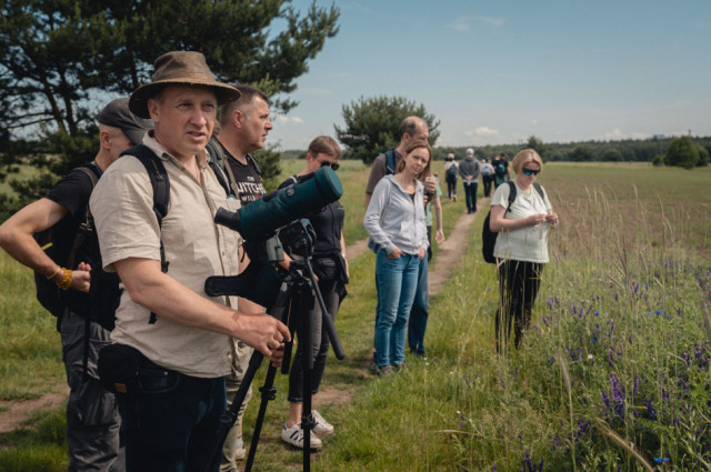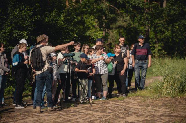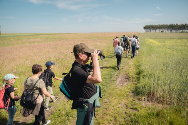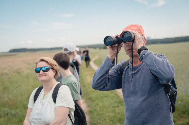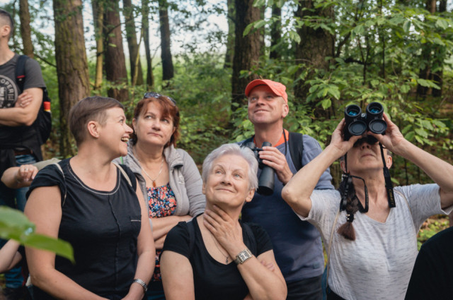 Następnie wyszliśmy na śródpolną drogę prowadzącą nas polami, wśród wąskich pasków zadrzewień. Z bardzo daleka można było dostrzec siedzące na słupach przewodów elektrycznych czarne sylwetki kruków. Pola niemal na całej trasie wypełniał śpiew skowronków polnych. Zupełnie niespodziewanie, w mijanym lasku z cherlawych sosenek, pokazała się pojedyncza sikorka czubatka, ale jej ruchliwość i chowanie się w koronach tylko niektórym pozwoliła dostrzec charakterystyczny „czubek” z piór. Dalej, wśród pól, o kilkaset metrów od nas wylądował pojedynczy żuraw, który zupełnie nie zwracał uwagi na naszą obecność – żerował i spokojnie poprawiał pióra. Nad kępą lasu w oddali majestatycznie krążył myszołów, pokazując swoje duże, szerokie skrzydła uniesione w kształcie delikatnej litery „V”. Nieopodal drogi, na ugorze spostrzegliśmy parę kontrastowo upierzonych pokląskw, z białymi brwiami i pomarańczową piersią, które wdzięcznie pozowały na suchych łodygach nawłoci i każdy mógł nasycić się ich widokiem patrząc przez lunetę.