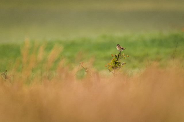 - Gąsiorek – para ptaków na krzewach róży i głogu na ugorze
