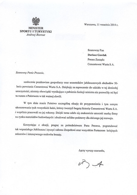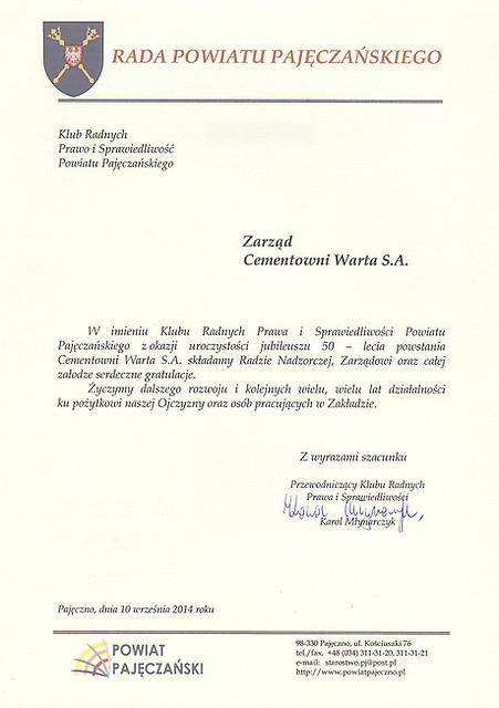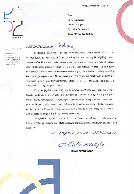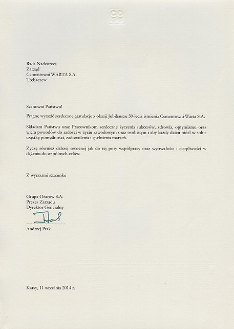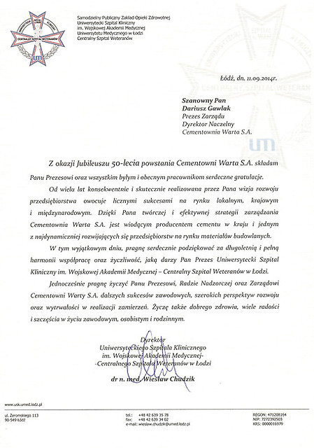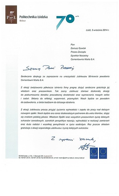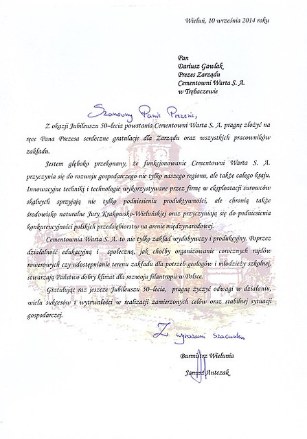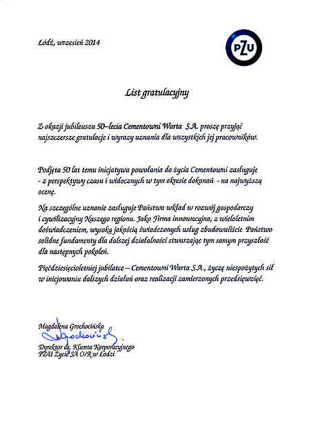 Rok 2014 jest dla nas – pracowników Cementowni „Warta” S.A. w Trębaczewie rokiem wyjątkowym. To czas pewnych refleksji, podsumowań, ale także okazja do świętowania okrągłego Jubileuszu. Cementownię Warta S.A. i jej obecną pozycję stworzyli pracujący w niej przez te wszystkie lata ludzie. To dzięki nim istniejemy już 50 lat z optymizmem patrząc w przyszłość. Jubileusz i przygotowana z tej okazji uroczysta Gala daje sposobność do spotkania wszystkich tych, którzy uczestniczyli w tworzeniu historii firmy, służyli jej radą, pomagali, czy udzielali kredytu zaufania i którym chcemy w ten sposób wyrazić podziękowanie. Szczególne podziękowania składamy dla naszych głównych akcjonariuszy, którzy w odpowiednim czasie zainwestowali w nasz zakład chroniąc go przed upadłością, a także nadal dbają o jego rozwój i unowocześnienie.