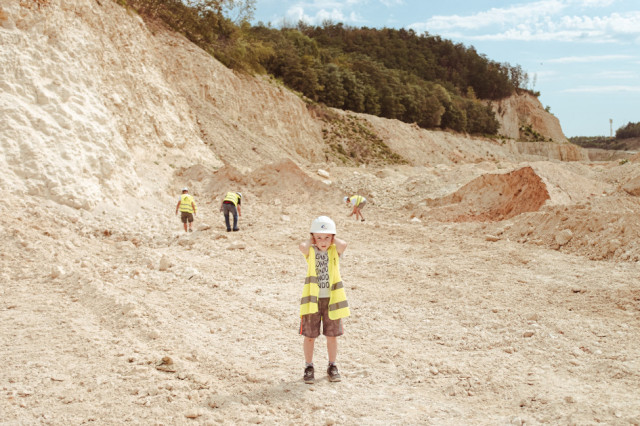 W trakcie spaceru mieliśmy również możliwość podziwiania pracy niektórych urządzeń wydobywczych. Szczególnie ciekawa była koparka pobierająca urobek spod wody. Swoistą atrakcją była również inna koparka, w której, gdy tylko się do niej zbliżyliśmy, włączył się alarm i jego dźwięk towarzyszył nam przez dłuższą chwilę. Ale nasza uwaga była już wtedy skupiona na czymś innym – każdy z uczestników mógł nieco ubrudzić sobie ręce, poszukując ładnych okazów wapieni, skamieniałości i krzemieni pasiastych. Jednej z osób udało się znaleźć niewielki fragment odcisku amonita, większość natrafiała na małe muszle ramienionogów, za to krzemienie okazały się dość powszechne, a niektóre z nich były naprawdę ładne. Szczególne zainteresowanie młodzieży wzbudziła potężna buła krzemienna. Oczywiście musieliśmy zobaczyć, co może ona kryć i środku. W ruch poszedł młotek i udało się dostać do krzemiennego wnętrza.