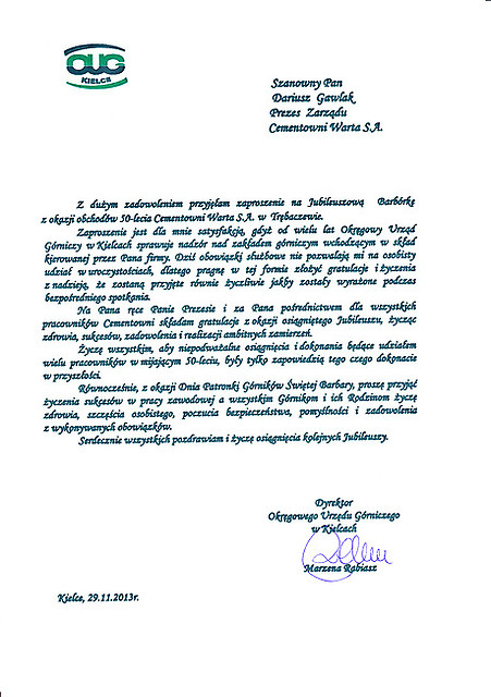 50 rocznica powstania firmy jest wydarzeniem szczególnym dla każdego przedsiębiorstwa. Wszyscy jesteśmy dumni z tego, co udało nam się osiągnąć. Odnosząca sukcesy firma z tak bogatą i ciekawą historią to coś więcej niż interes przynoszący zyski. To przede wszystkim ludzie, którzy tu pracowali, pracują i żyją. Składam podziękowania przybyłej na Barbórkę emerytowanej kadrze, w tym byłym dyrektorom Cementowni Warta, a także obecnej załodze za to, że trudem i ciężką pracą budują i rozwijają ten zakład.