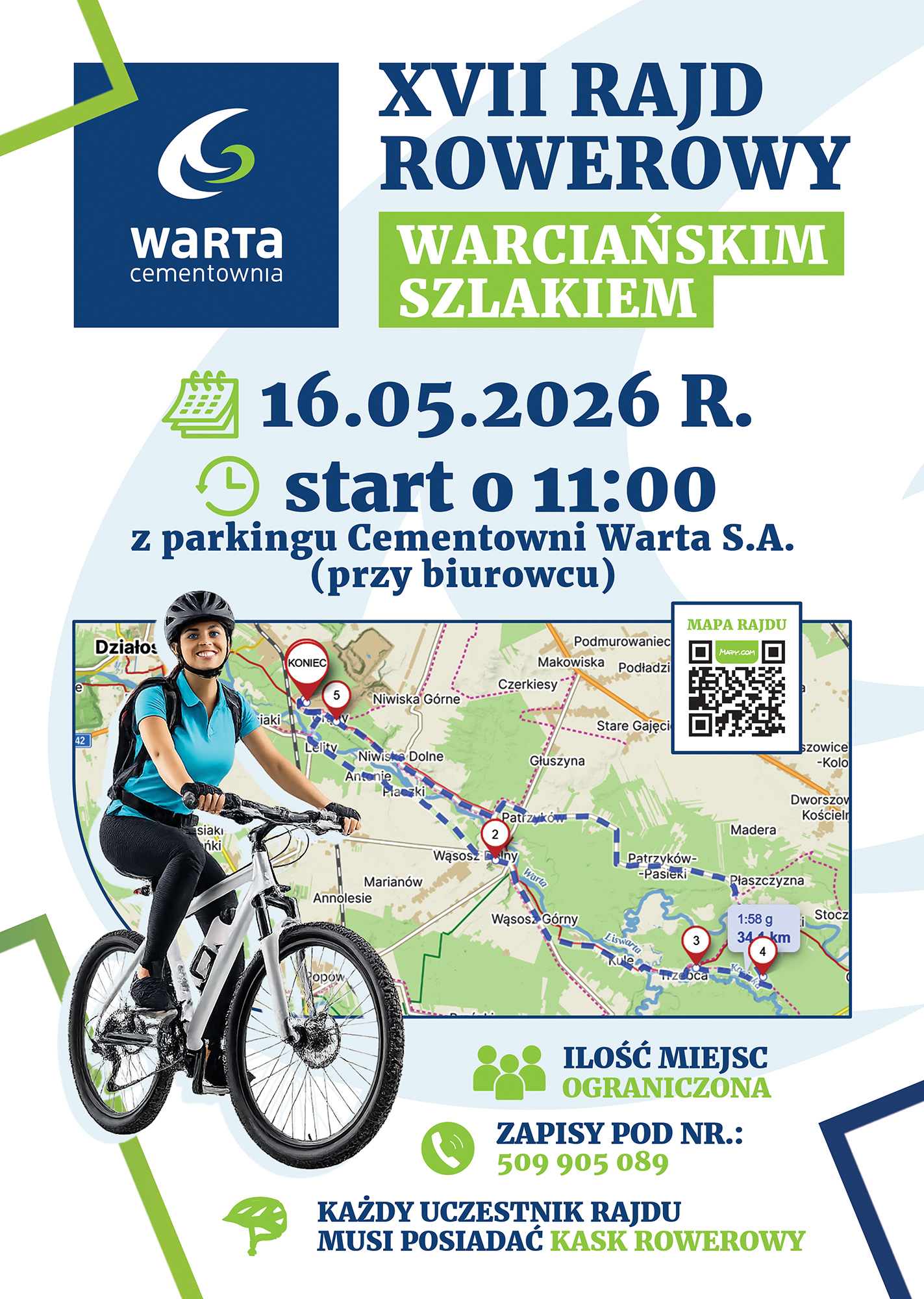 Już 16 maja 2026 roku zapraszamy wszystkich miłośników dwóch kółek na wyjątkowy rajd rowerowy! Przygotowaliśmy dla Was trasę o długości 34 kilometrów, która pozwoli Wam aktywnie spędzić sobotnie przedpołudnie w malowniczej okolicy. Start i meta rajdu znajdować się będą na parkingu Cementowni Warta S.A., a zbiórkę zaplanowaliśmy na godzinę 11:00.